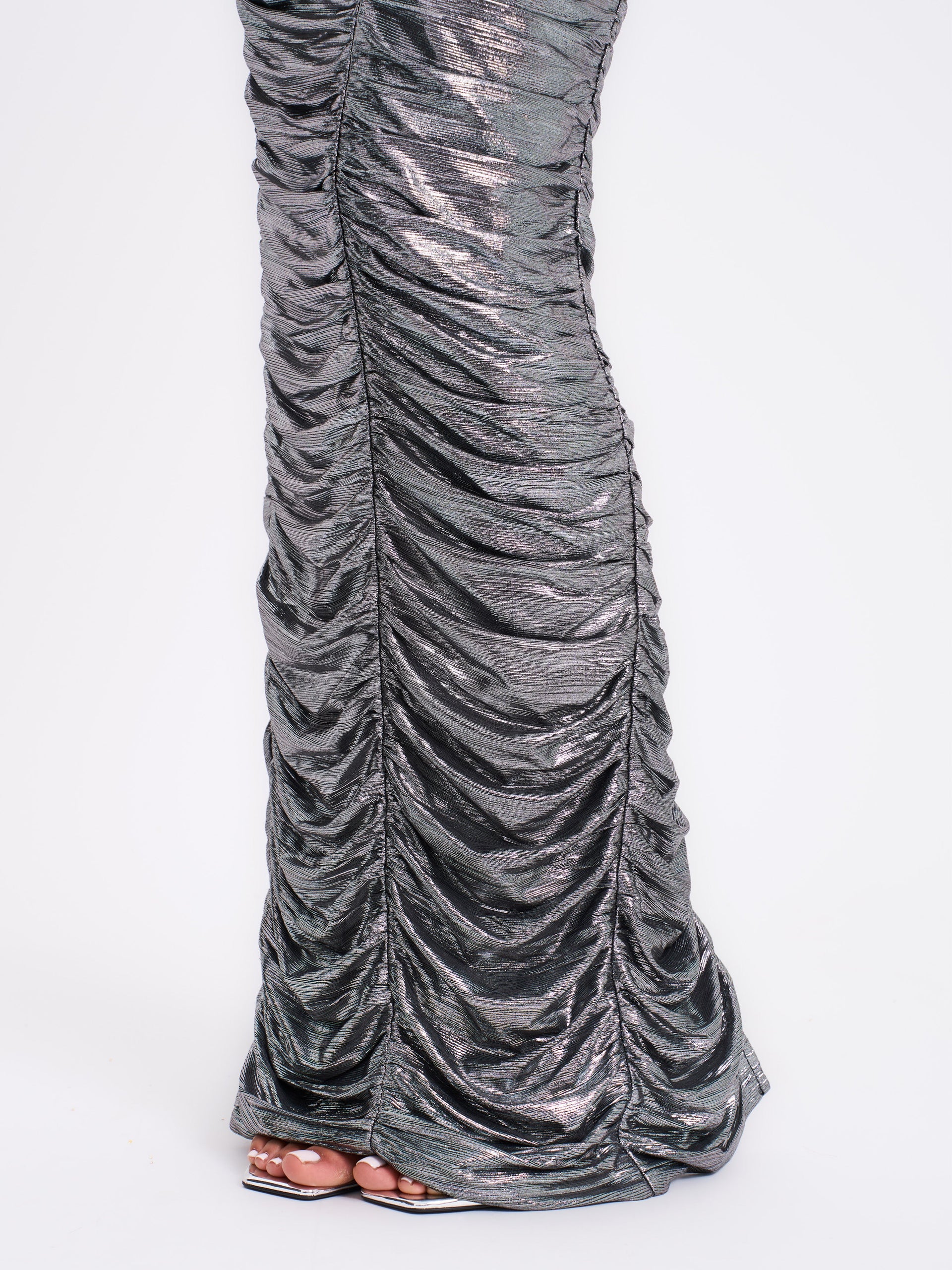 Abril Ruched Silver Glitter Backless Gown