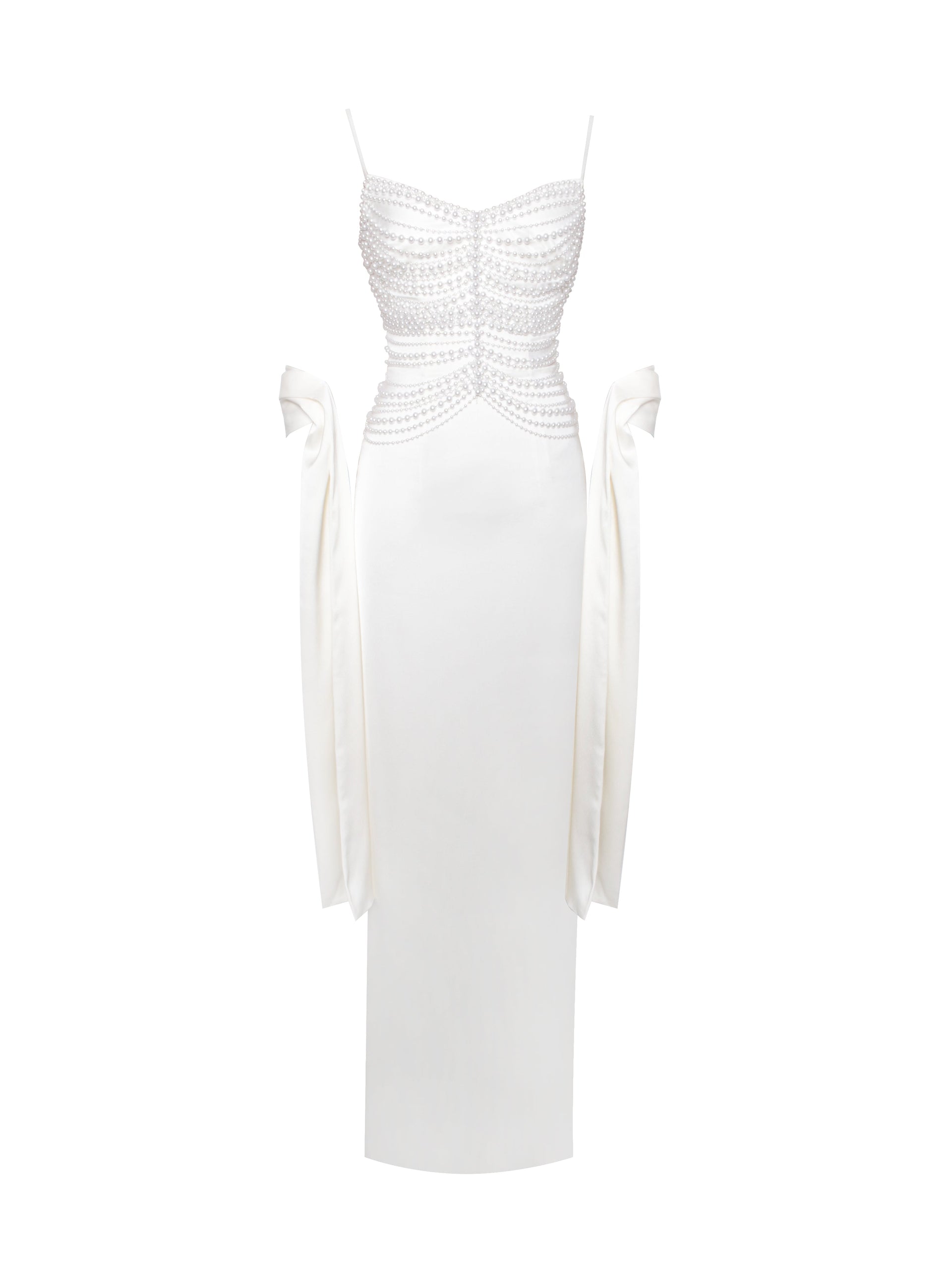 Introducing the Karmen Dress, a vision of timeless elegance in pearl white satin. This sleeveless straight slip dress features adjustable straps for a customizable fit, while the decorative pearl chain top adds a touch of luxury and sophistication. A back slit enhances movement and allure, complemented by an invisible zipper for a seamless look. Pair it with the matching pearl white long scarf for a cohesive and graceful ensemble, perfect for making a refined statement at any occasion.