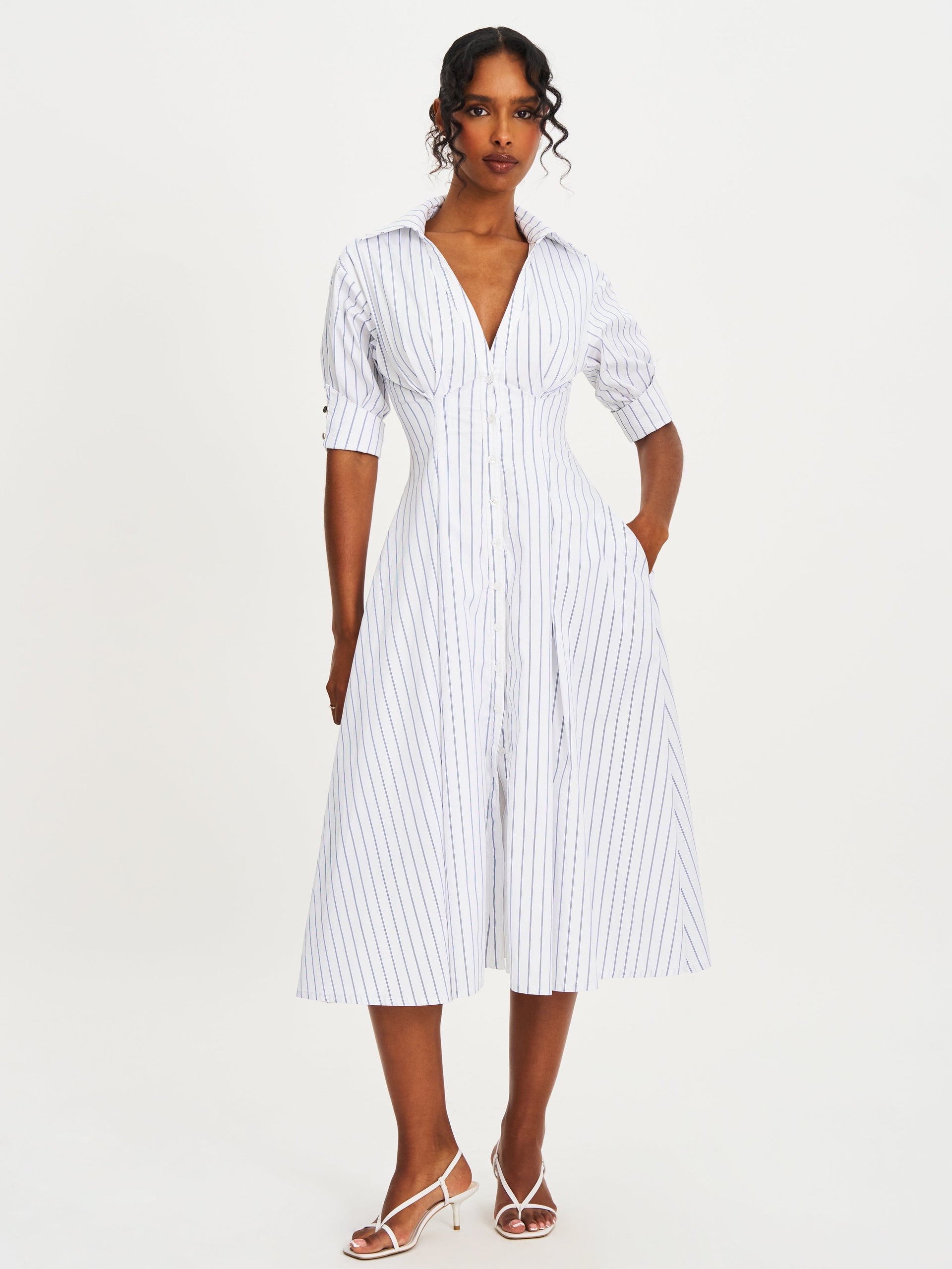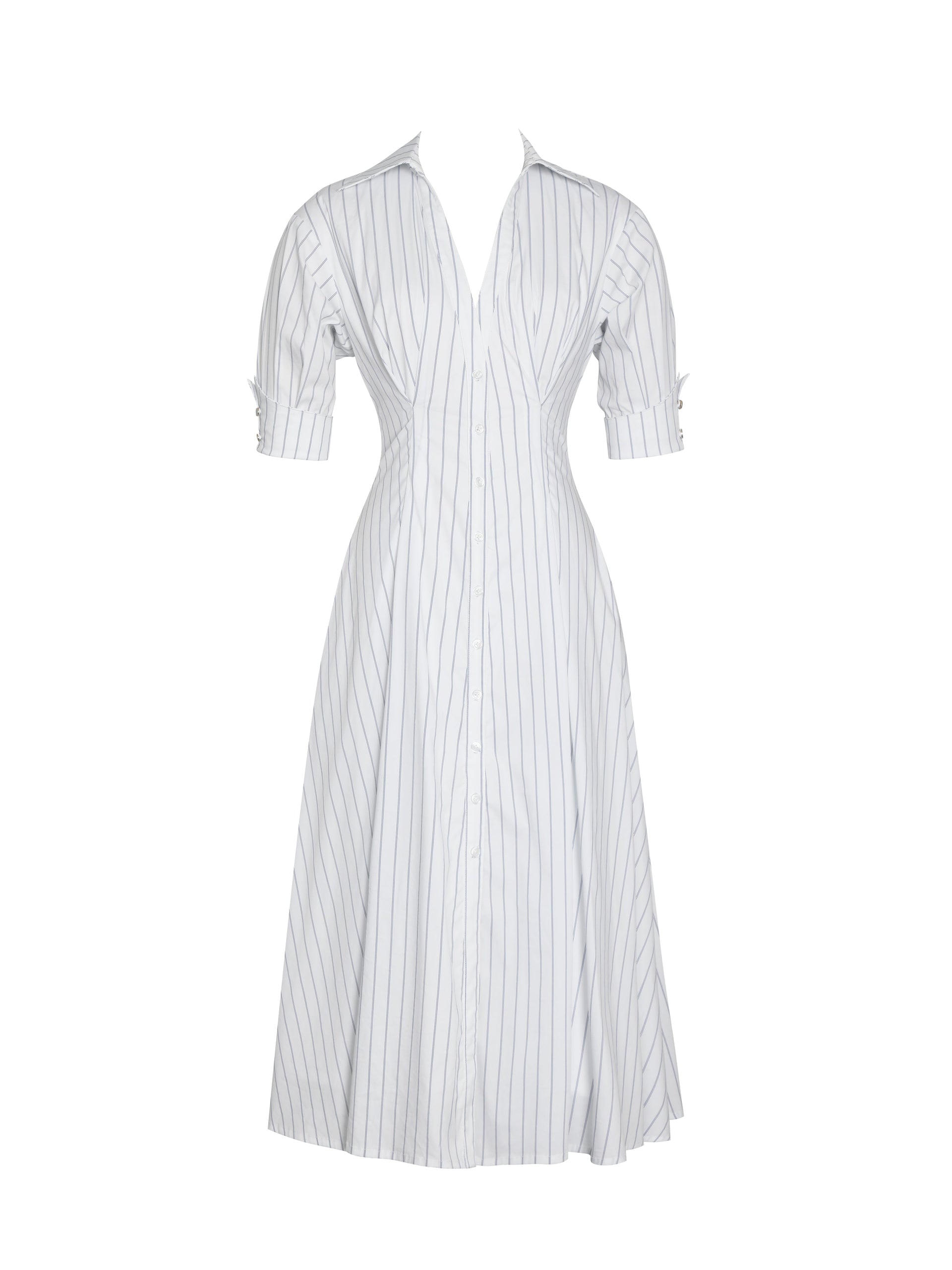 The Palina Dress redefines preppy elegance with its timeless shirt dress silhouette. Made from breathable Cotton Poplin fabric, this midi-length dress features delicate pleated detailing and pinstripes that adds a touch of sophistication. The button-up front and black cuff buttons create a polished business casual look, perfect for both formal and daily wear. Thoughtfully designed with invisible pockets, this versatile white dress is a wardrobe staple for effortless style and comfort.