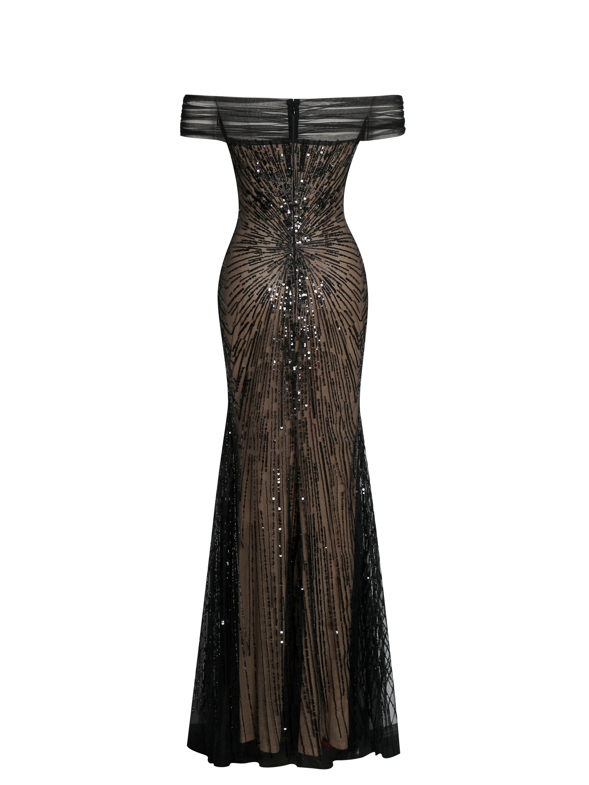 Dazzle in the captivating elegance of the Qeturah Dress, a masterpiece of intricate design and modern allure. Crafted from black mesh fabric adorned with embroidered radiant-shaped sequins, this gown shimmers with every movement. The ruched mesh off-shoulder neckline adds a soft, romantic touch, while the mermaid silhouette highlights your curves with grace and sophistication. Fully lined with a nude lining for comfort and contrast, the dress is finished with an invisible zipper for a seamless look. Perfect for any special occasion, the Qeturah Dress ensures you’ll shine effortlessly.