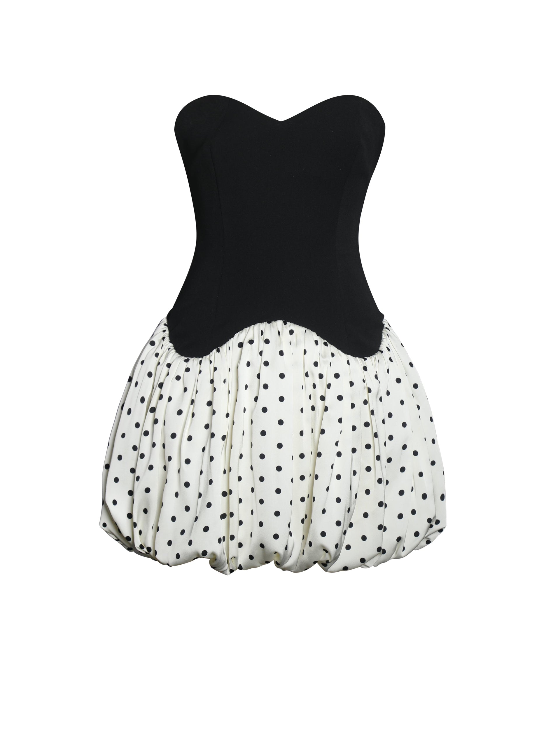 The Dahliana Dress brings vintage charm to modern silhouettes with its bold black and off-white polka dot contrast. Featuring a sweetheart neckline and strapless design, this mini dress is structured with a built-in corset and a flattering W-shape drop waistline. The bubble hem adds playful volume, while a lace-up back and invisible zipper ensure a perfect fit. Fully lined with practical pockets, it’s a standout choice for parties, date nights, or special events.