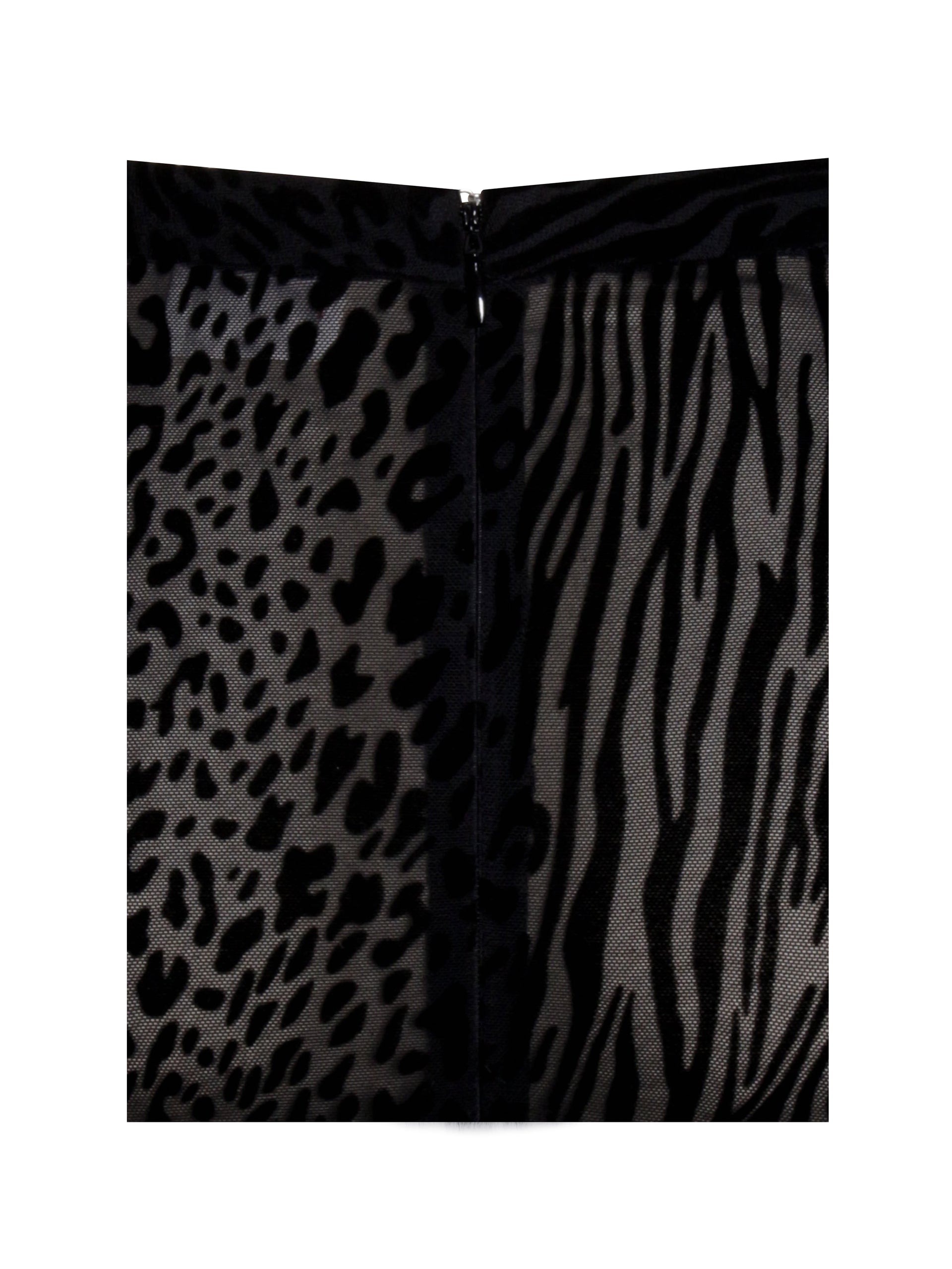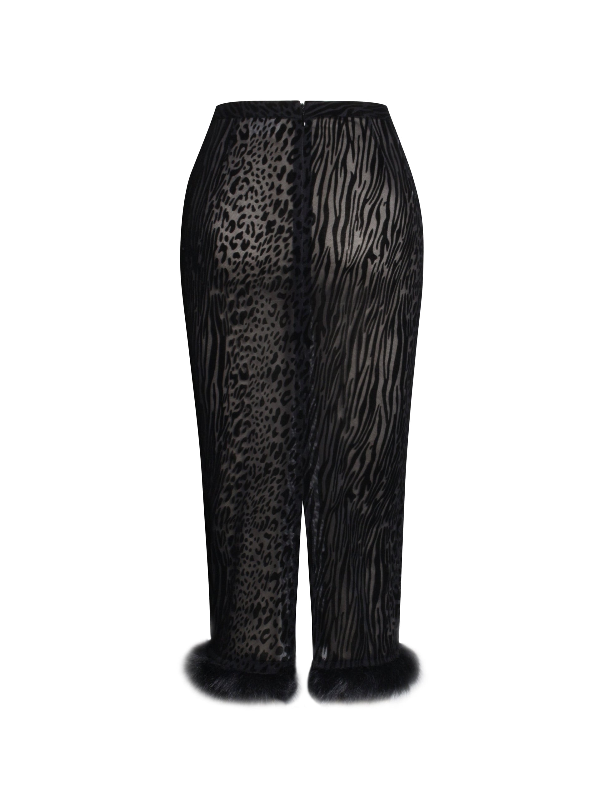 Complete your look with the Halia Skirt, a show-stopping piece made from animal print velvet burnout mesh fabric. This stretchy skirt is designed to flatter, featuring a dramatic fur trim hem for added elegance. Finished with an invisible zipper, the Halia Skirt is the perfect partner to the Hali Top, creating a bold and cohesive ensemble that’s perfect for turning heads.