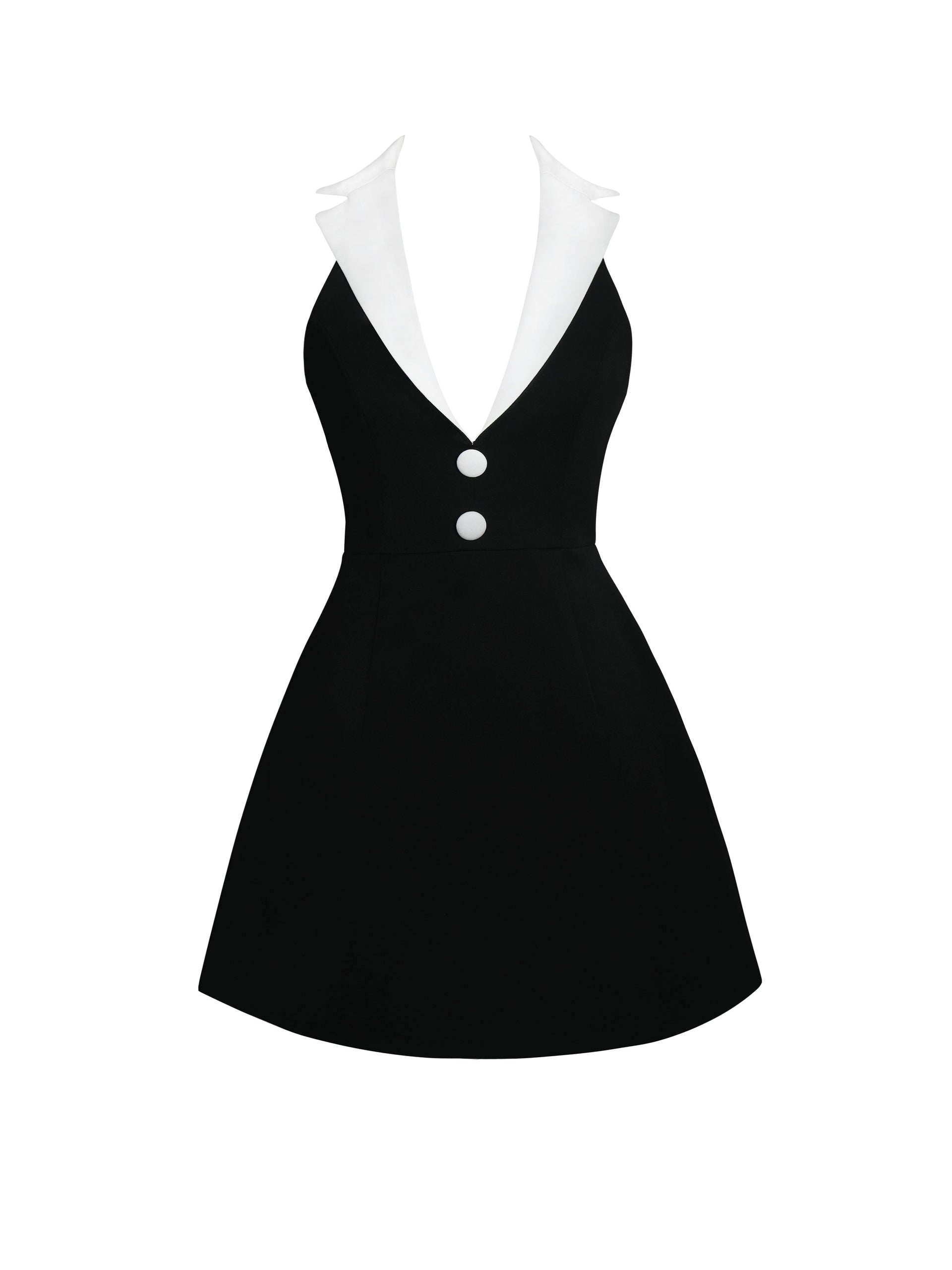 The Ignacia Dress blends classic charm with a modern twist in a refined black and white palette. Featuring a crisp white collar and coordinating white buttons, this preppy-style dress is tailored with a high waist and an A-line skirt that flatters every silhouette. The halter neckline leads into a striking backless design, offering a bold contrast to its otherwise polished look. Completed with an invisible zipper and hidden pockets for functionality, this dress is fully equipped for office days, casual outings, or formal events alike.