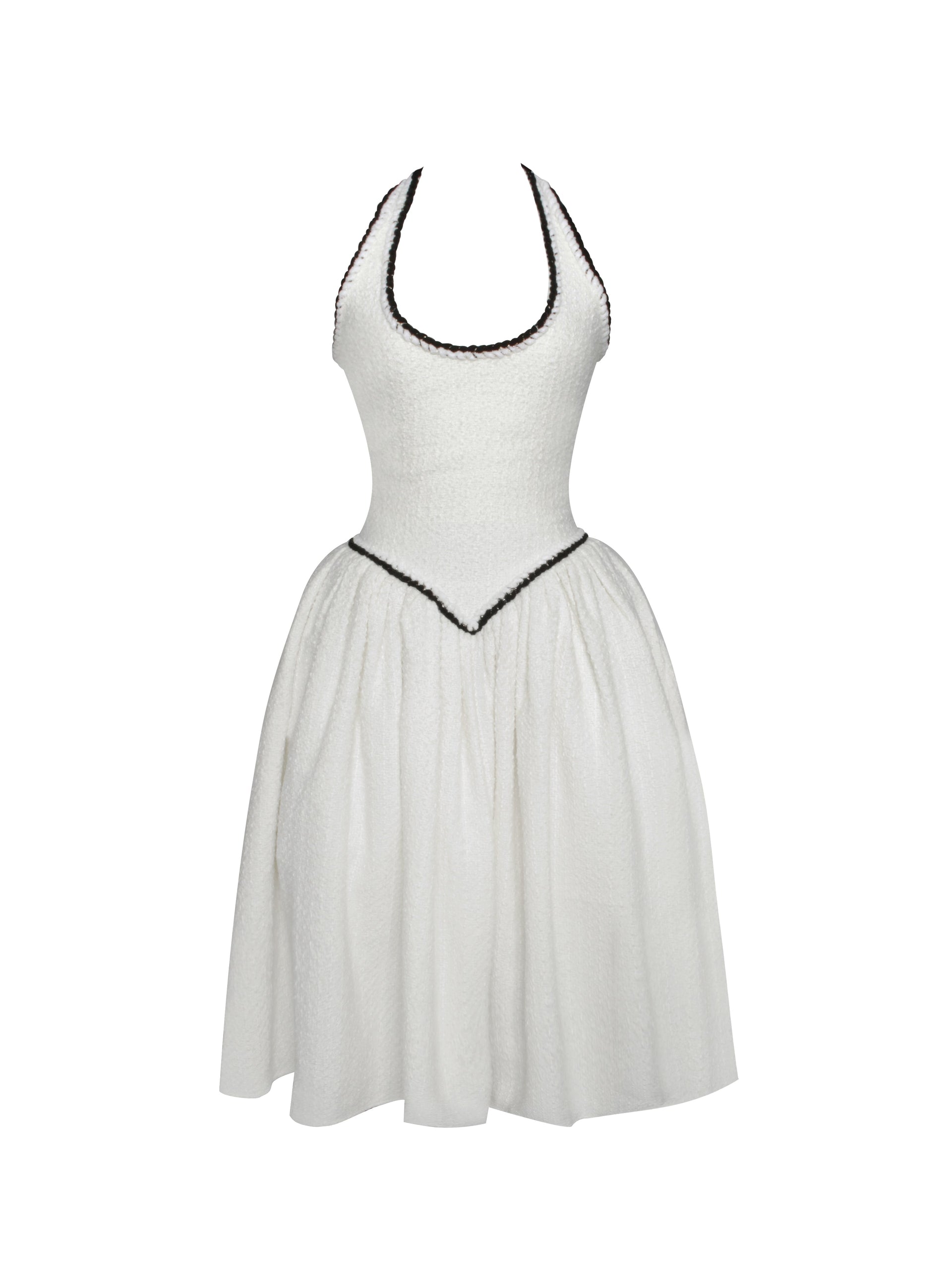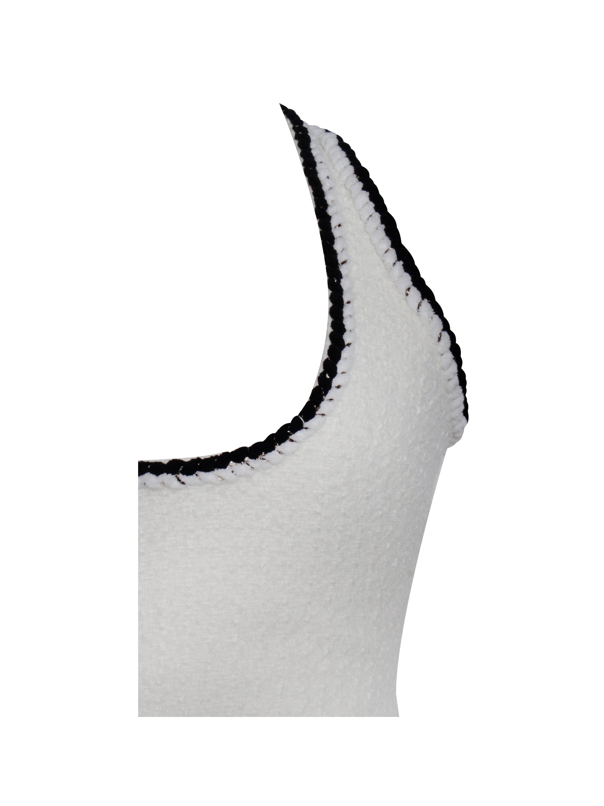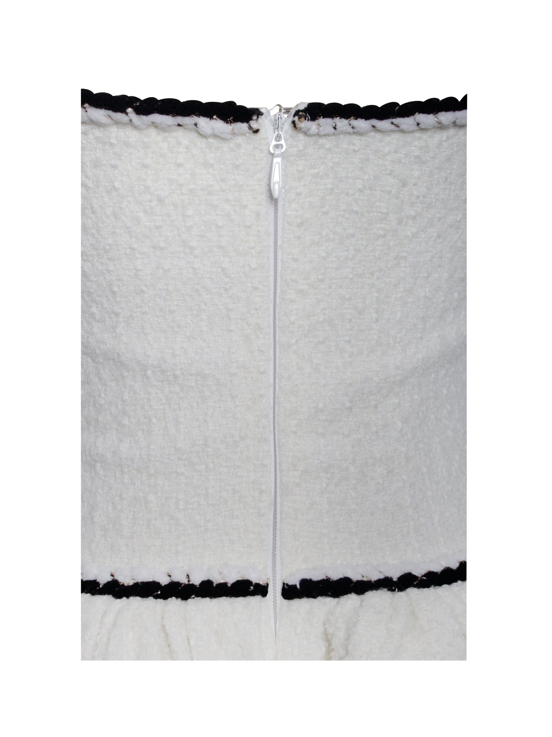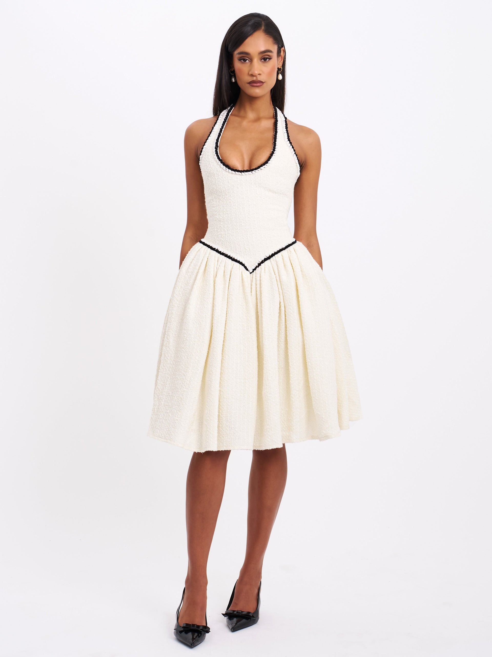The Natalie Dress blends timeless sophistication with modern details for an effortlessly chic look. Designed with a graceful U-neck halter neckline, it showcases a flattering black and white plait trim that accentuates its elegant lines. Crafted from luxurious tweed boucle fabric, this midi-length dress features a stylish drop waist and V-shape waistline for a tailored, figure-enhancing silhouette. Functional pockets add practicality, while the under-skirt supporting tulle ensures the skirt maintains its structured flair. Fully lined for comfort and a seamless fit, the Natalie Dress is the epitome of refined elegance, perfect for any occasion.