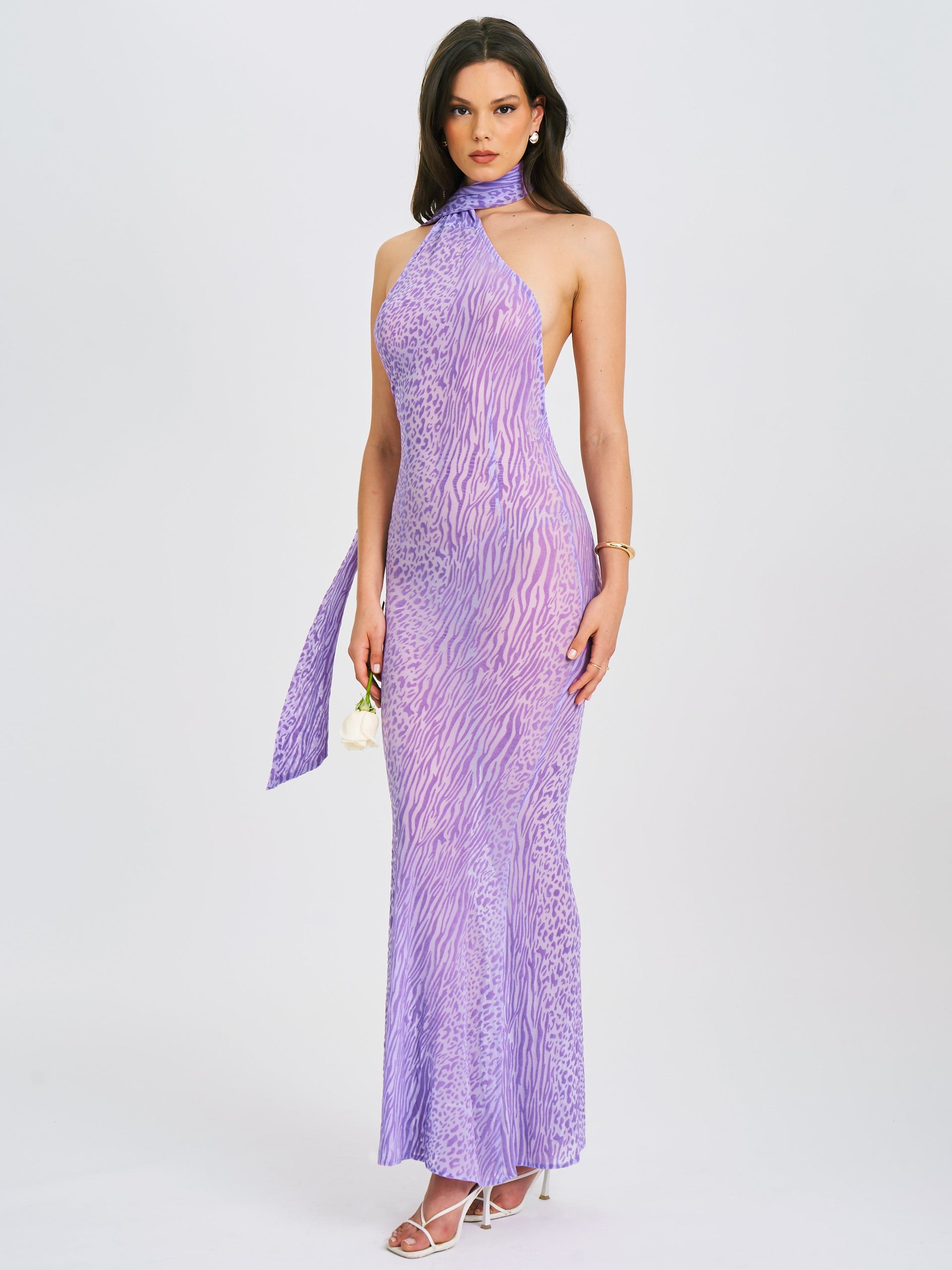 Introducing the Olena, a captivating Purple Burnout Velvet Animal Print Mesh Halter Neck Maxi Dress perfect for summer. This dress features a halter neck design, an alluring open back with button closures, and intricate burnout velvet detailing. The flowing maxi mermaid silhouette enhances your natural curves, while the high-stretch fabric ensures comfort and a sleek look. Ideal for beachside parties, sunset dinners, or any special occasion, the Olena dress will make you the center of attention. Embrace the summer vibes with this stunning piece.
