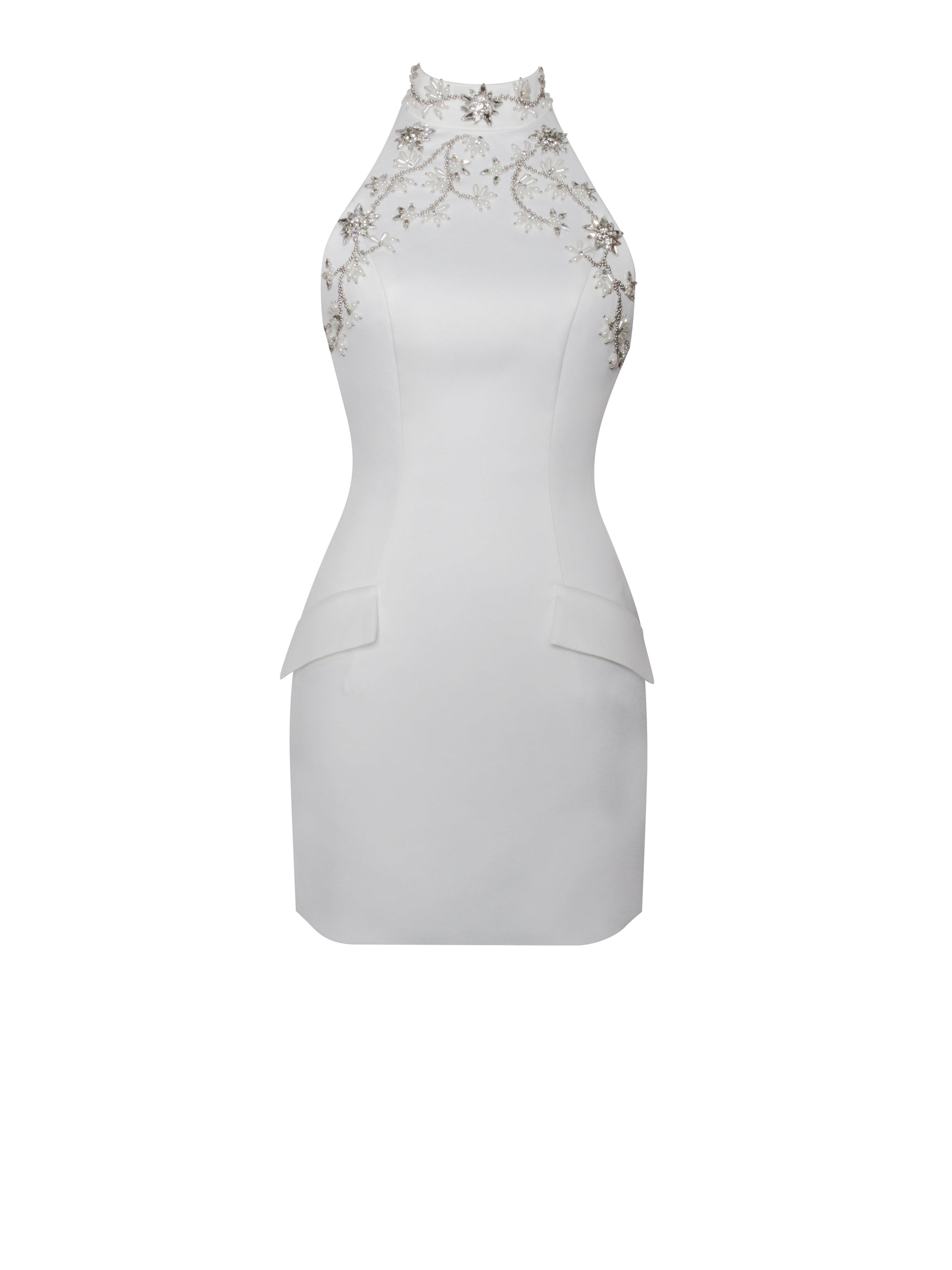 Ori White Halter Neck Crystal Pearl Mini Dress