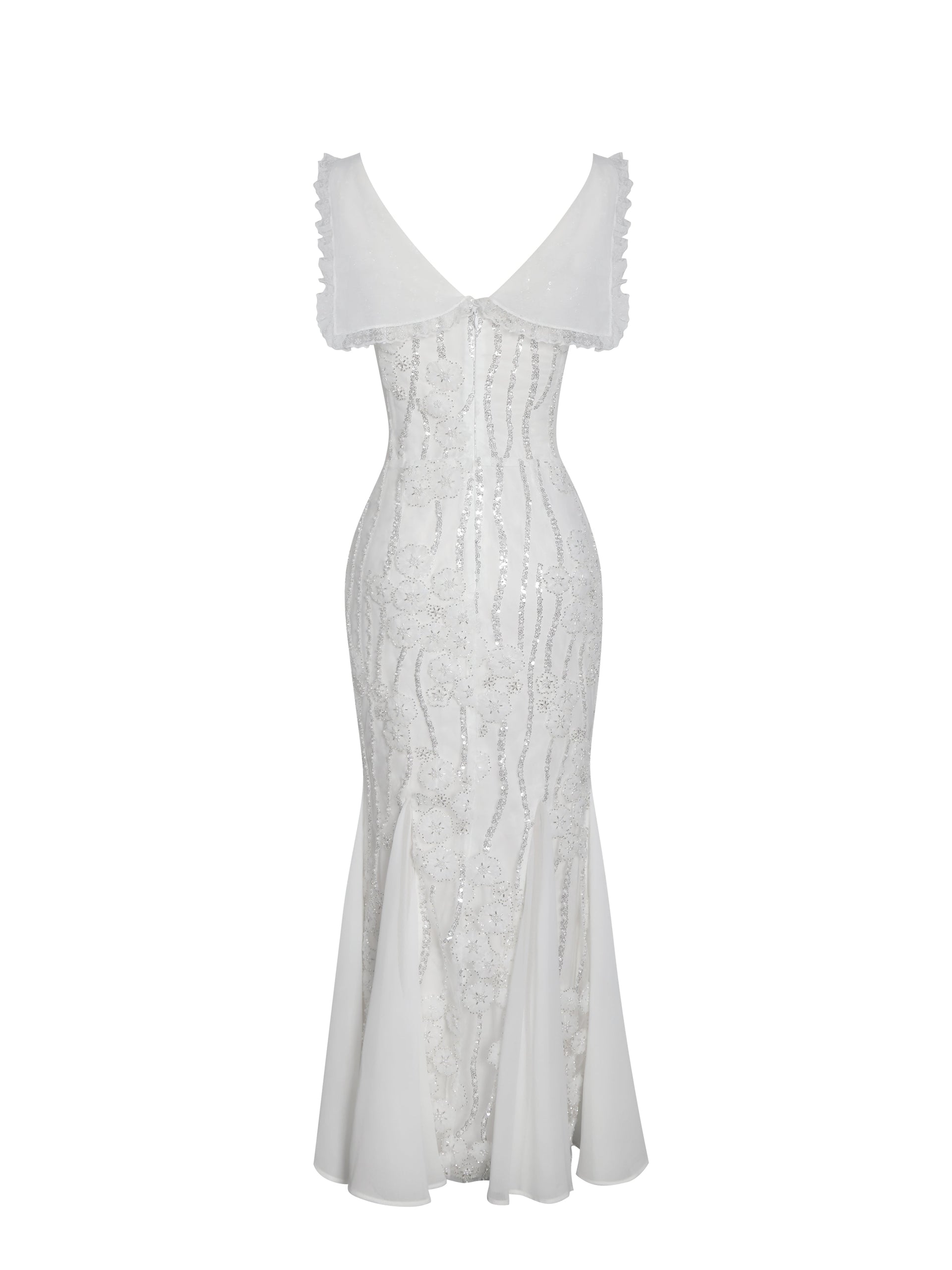 Introducing the Paola Dress, a standout white gown that effortlessly blends elegant details with youthful charm. Its triangular Peter Pan collar, accented by a black velvet ribbon nestled in the V-neck, creates a striking focal point, while delicate lace trims the edges and elevates the design. Graceful godets add sweeping movement, complemented by shimmering sequins and beaded embellishments that highlight its exquisite craftsmanship. With a soft, romantic mermaid silhouette balanced by a lively summer spirit, this fully lined dress features a back zipper closure for a flawless fit. Perfect for elegant brunches, afternoon teas, and leisurely weekend celebrations.