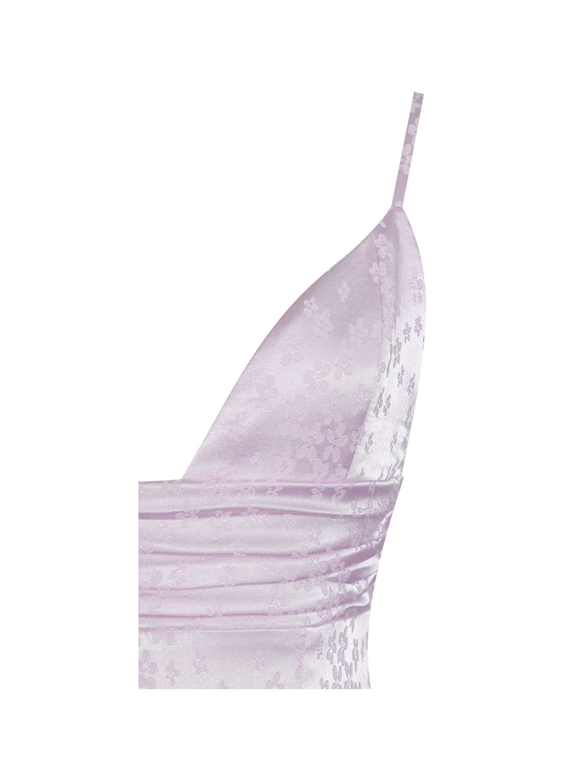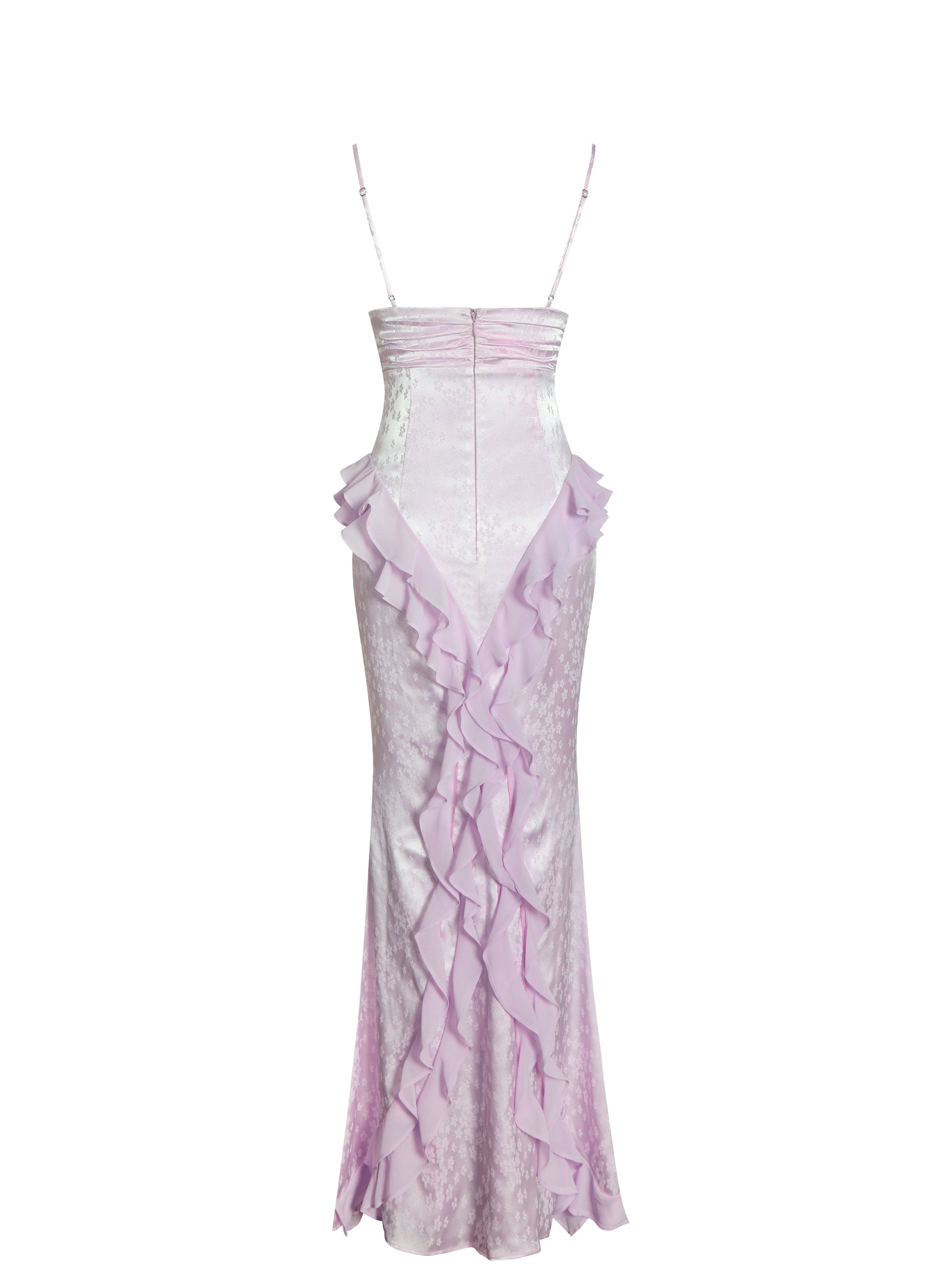 Soft, dreamy, and just the right amount of fancy—the Paolina Dress mixes floral satin jacquard with fluttery chiffon ruffles for an ethereal vibe you’ll want to live in. A low V-neckline and drop waist get a flattering boost from ruched detailing under the bust, sculpting a silhouette that’s both elegant and fun. Waterfall chiffon cascades from waist to flared hem, swirling with every step like a gentle breeze. Adjustable straps and an invisible back zipper make sure the fit is just right, while the fully lined lilac fabric keeps things luxuriously light. Perfect for brunch dates and weekend escapes that call for effortless romance.