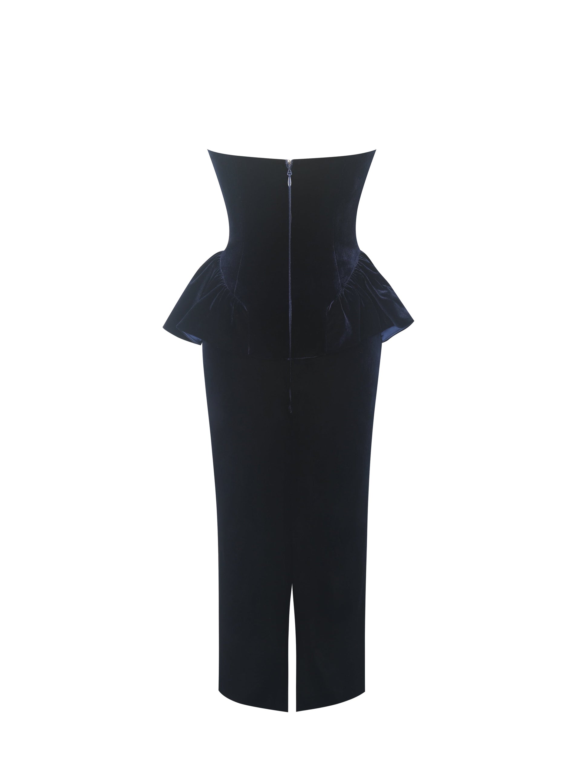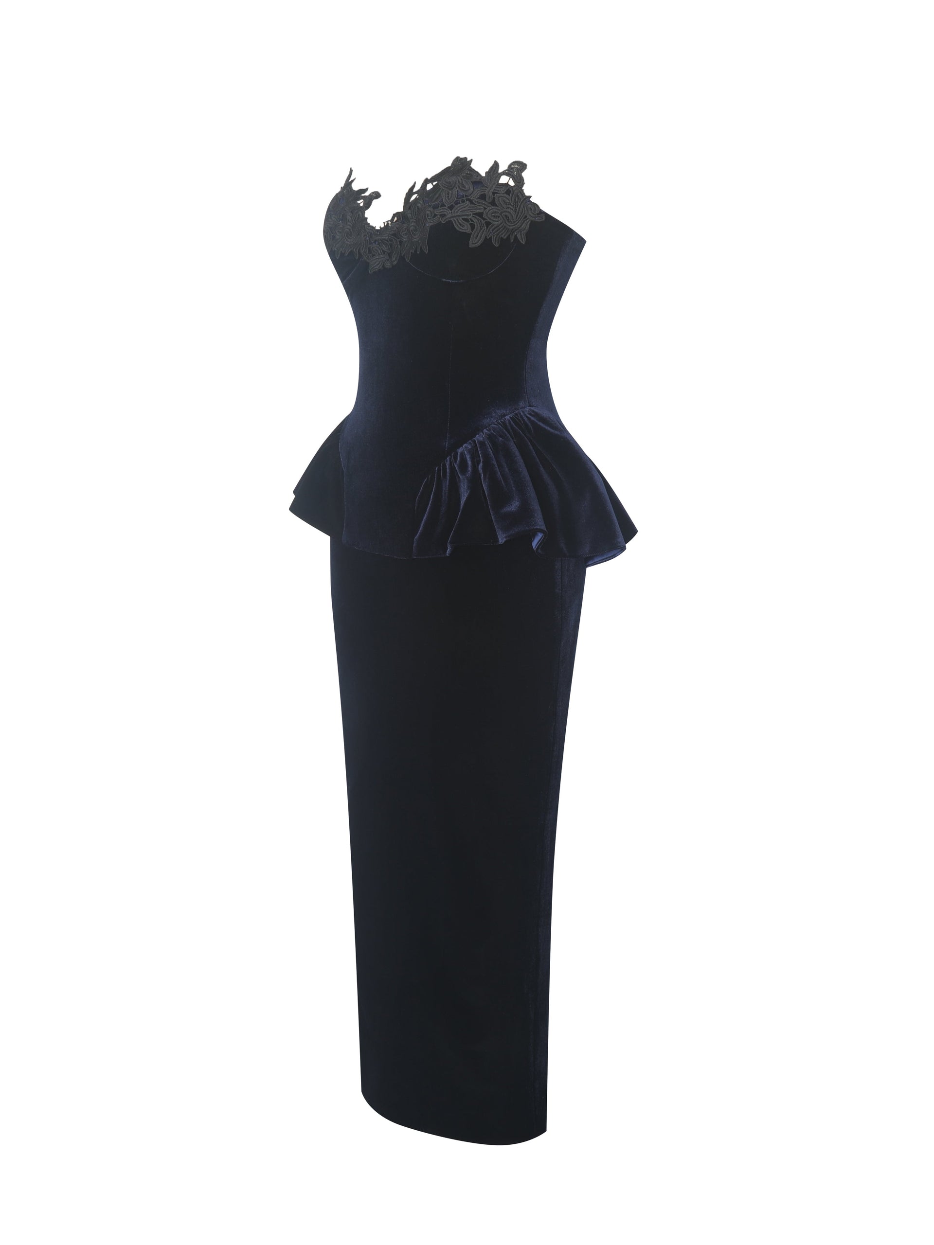Say hello to velvet drama with the Pascha Dress—a strapless stunner that brings old-Hollywood glamour with a wink. Crafted in rich, sculpting black velvet, this peplum midi features a sweetheart neckline, built-in cups, and a hidden corset that cinches just right. Hand-sewn lace appliqué dances along the bust for a touch of romance, while princess seams and a low-waisted cut serve serious hourglass energy. The full-length skirt sways with ease, thanks to a back vent that keeps things effortlessly graceful. Lined in satin and finished with an invisible zipper, it’s your go-to for black-tie nights, gala glows, and unforgettable entrances.